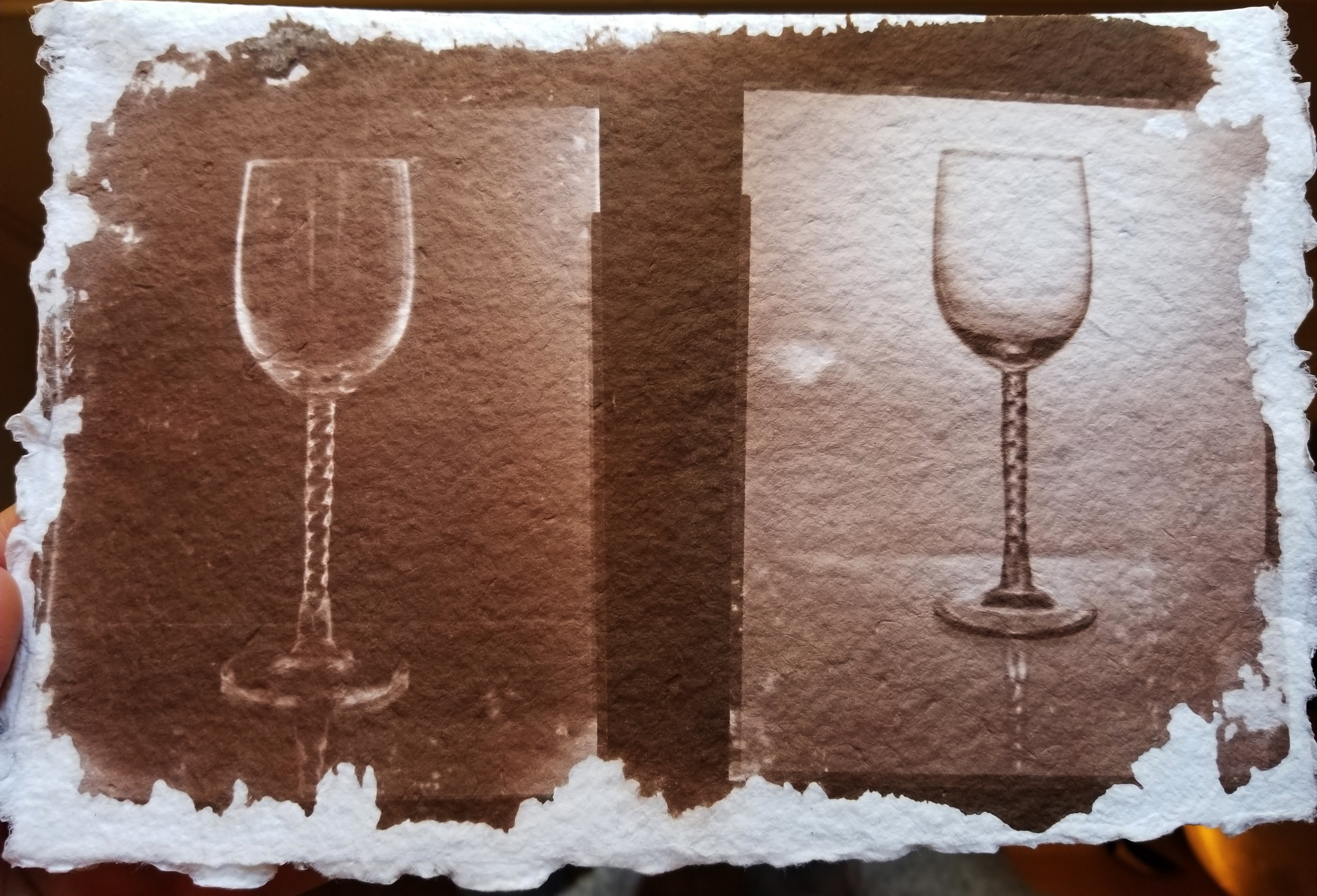 Materials: distilled water, table salt, acid free fine-art paper, silver nitrate, sodium-thiosulfate, a printable large-format negative, and a picture frame. Salt print made using 4x5 negatives and thick rag watercolor paper. I used some old 4x5 negatives that I had taken during my photography degree classes and thick rag watercolor paper. I did attempt to use paper with gelatin sizing coating one side however all attempts with the coated paper failed.